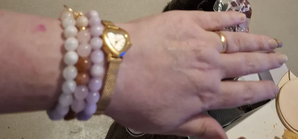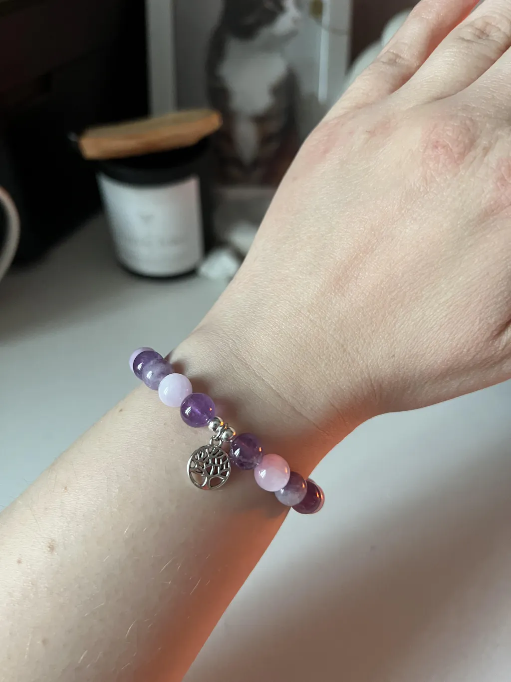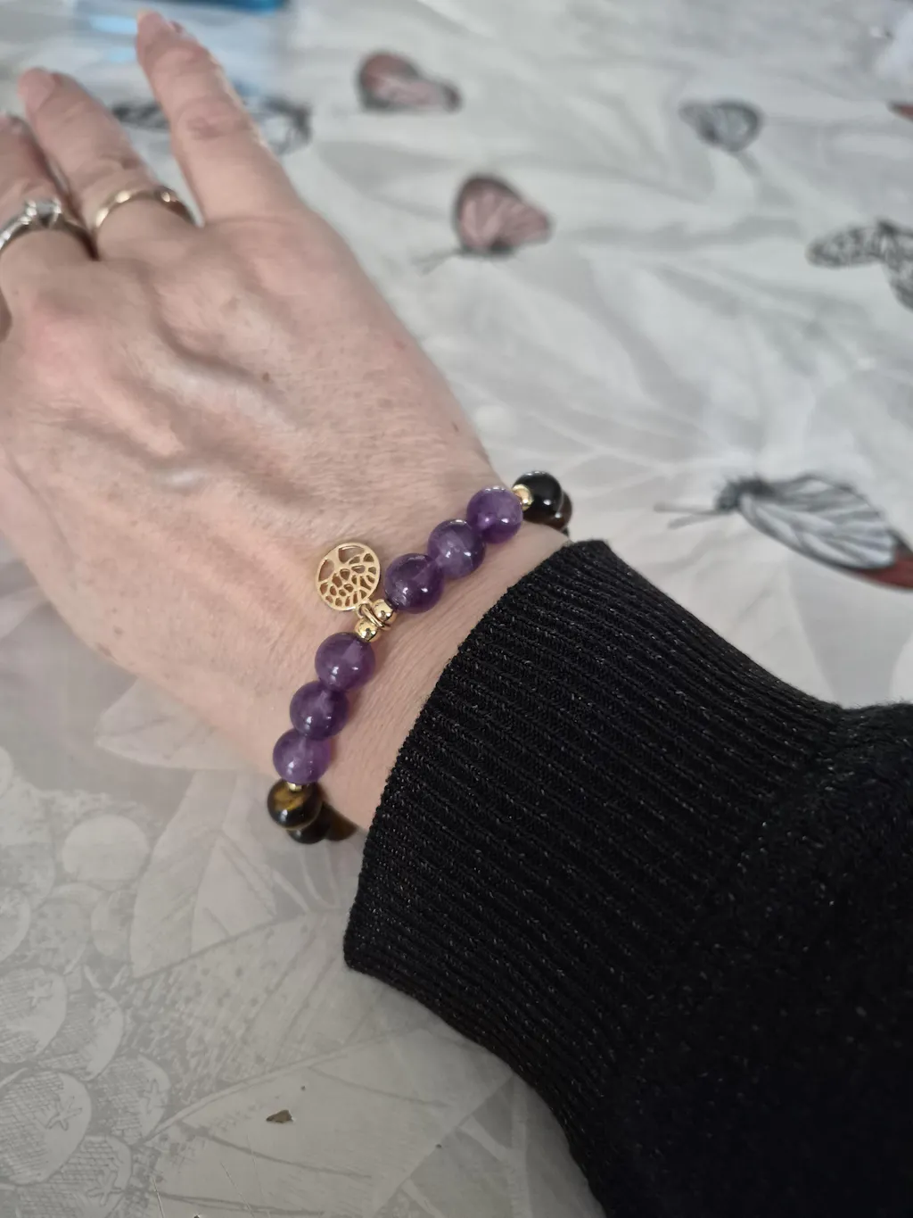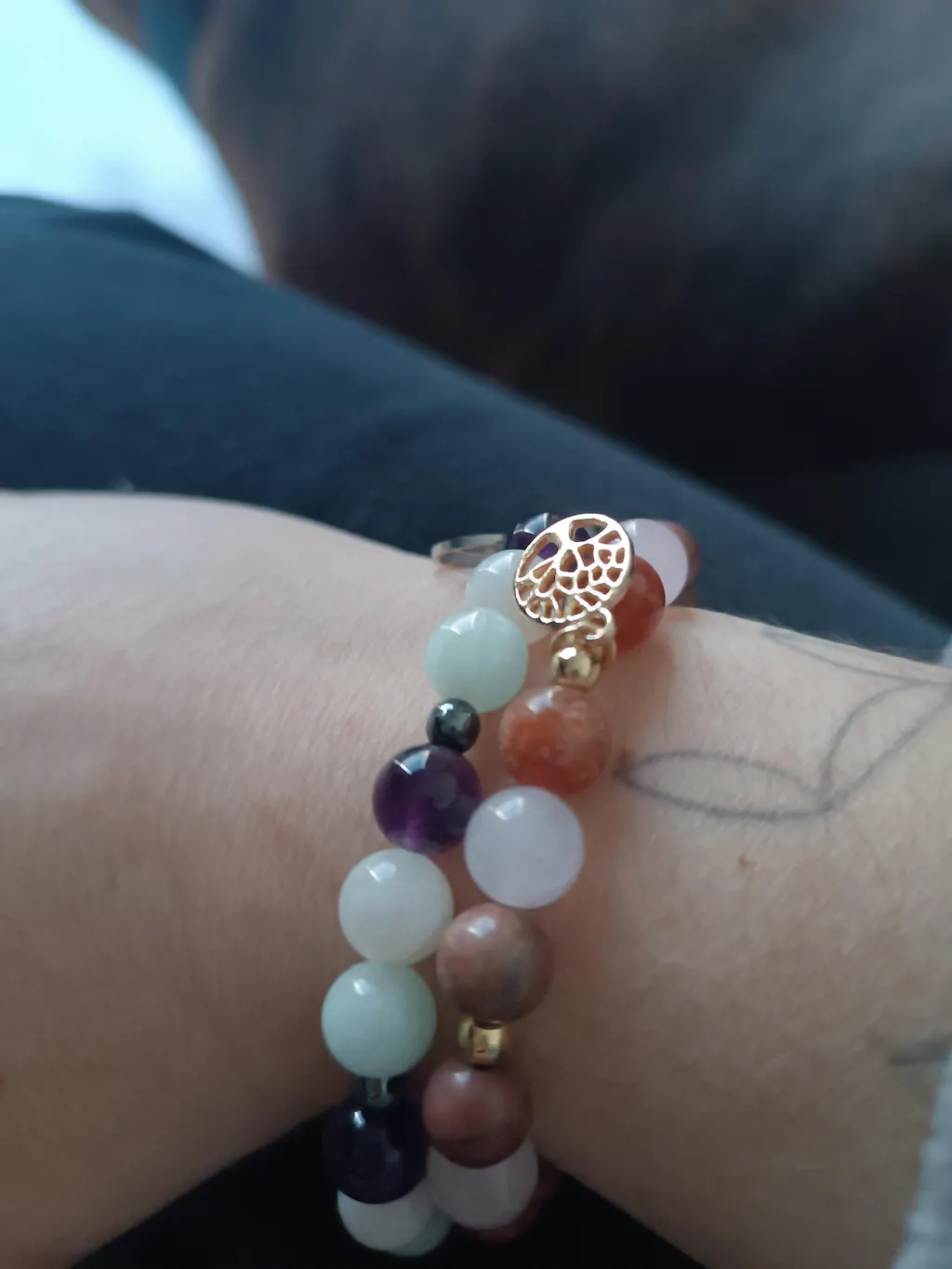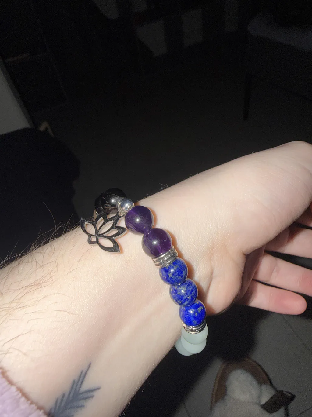 Comme toujours, je suis satisfaite de la qualité du bracelet, marjolaine est aux petits soins, ce bracelet m'a tout de suite attiré de par ses couleurs lilas et les vertus des 3 pierres. Je le trouve magnifique. Marjolaine est clairement la meilleure !