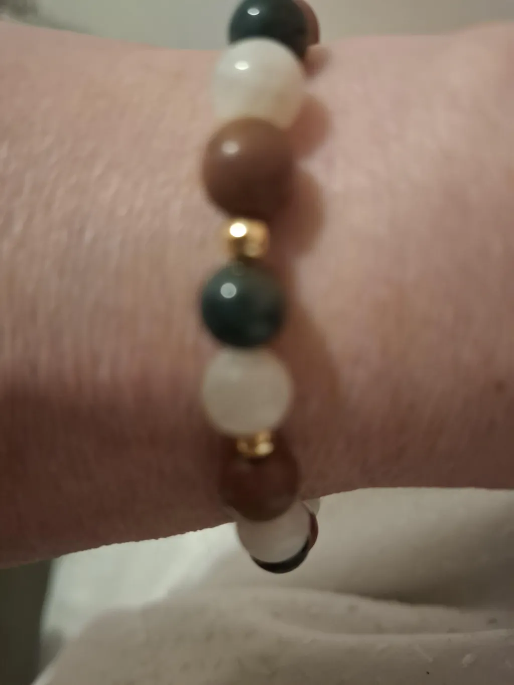 Jai acheter 4 bracelet (amazonite , apatite bleue , labradorite et agate mousse ) et elles sont de pure beauter ! Vraiment tres contente et la vendeuse est très gentille , elle est a l'écoute de ses clients et fait du très bon travail . Vraiment ravie de mes bracelets . Dailleurs jai recommander d'autres article cher elle , franchement allez y les yeux fermer car cest une personne de toute confiance .
