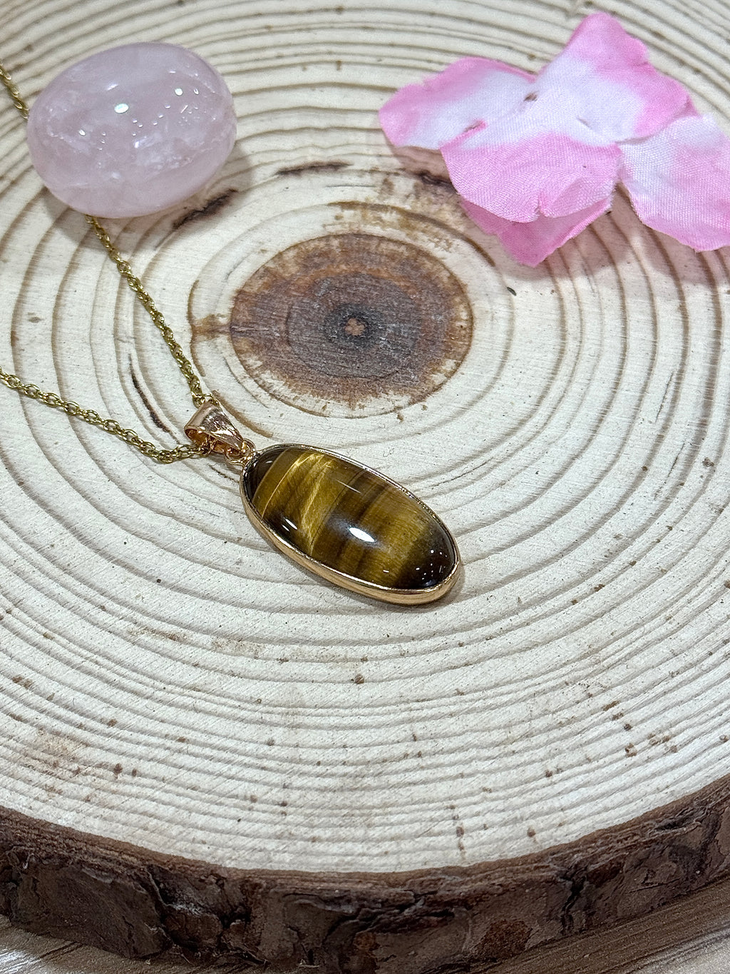 Matériaux utilisé : Œil de Tigre, plaqué or (chaîne en plaqué or de 50 cm offerte.